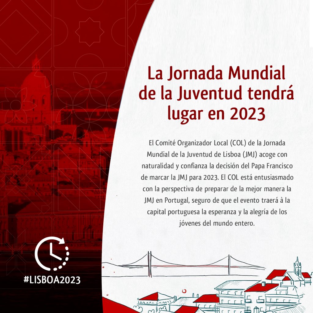 La Jornada Mundial de la Juventud (JMJ), que estaba programada para realizarse en Lisboa en el año 2022, ha sido aplazada por el Papa Francisco y el Dicasterio de Laicos, Familia y Vida del Vaticano, para agosto del 2023.
