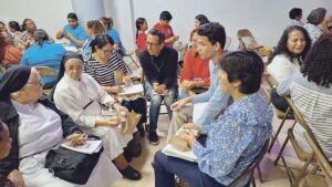 Catequistas en encuentros de reflexiones grupales sobre su papel de formadores de niños y jóvenes.