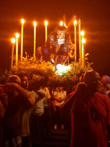 La imagen del Cristo Negro fue donada a la parroquia por una feligrés hace más de 50 años, como cumplimiento de una promesa: si sanaba de cáncer, entregaría una imagen del santo a la iglesia. La mujer fue curada y, en agradecimiento, hizo realidad su promesa. La imagen fue hermosamente decorada con luces y flores, y se convirtió en el centro de una procesión cargada de fervor popular.