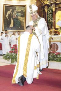Al finalizar la celebración, ocurrió lo inesperado para los ojos distraídos, pero profundamente significativo para los presentes. Monseñor Valdivieso, en un acto de humildad, se puso de rodillas para recibir la bendición del nuevo sacerdote.